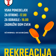 Ko nas jesensko vreme začne omejevati pri športnih aktivnostih na prostem, se praviloma začne rekreacija namiznega tenisa. Začnemo v ponedeljek, 29. septembra. Ob 17. uri bo termin za otroke, ob Beri dalje.. »